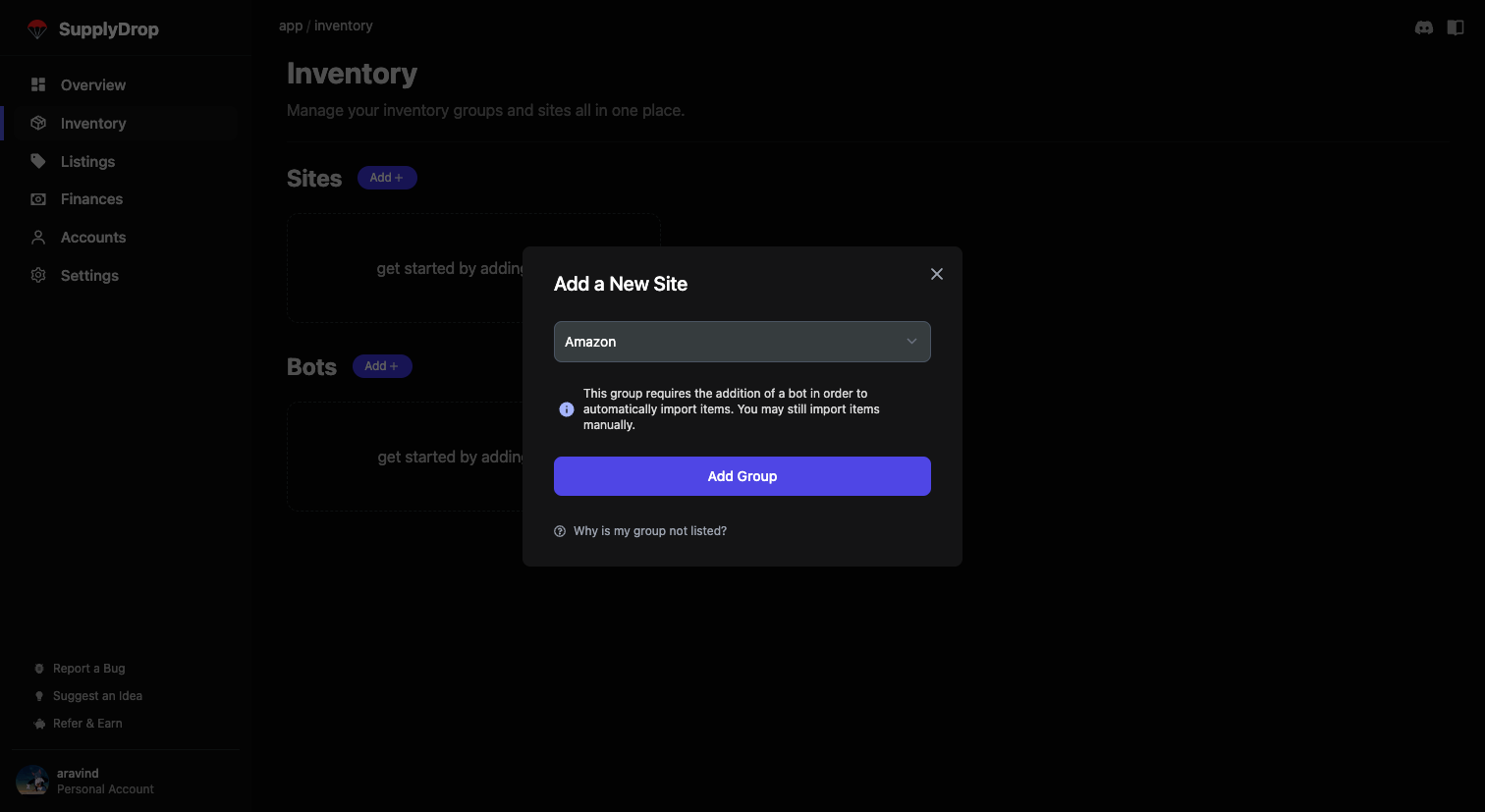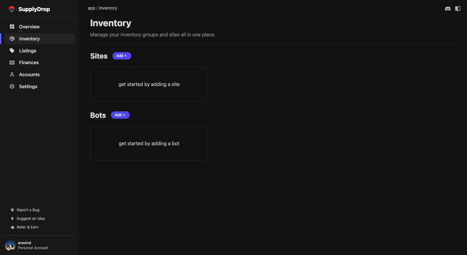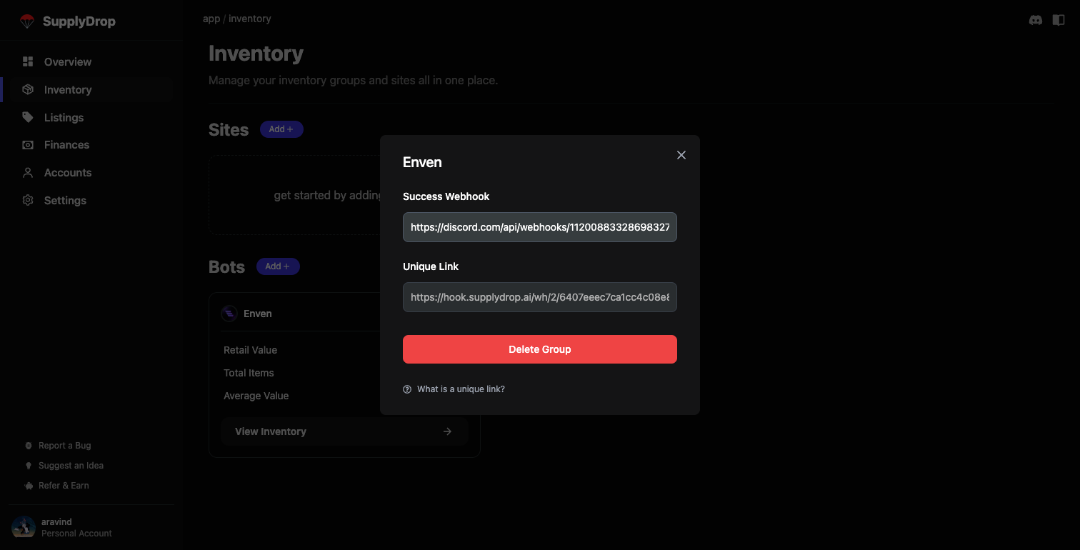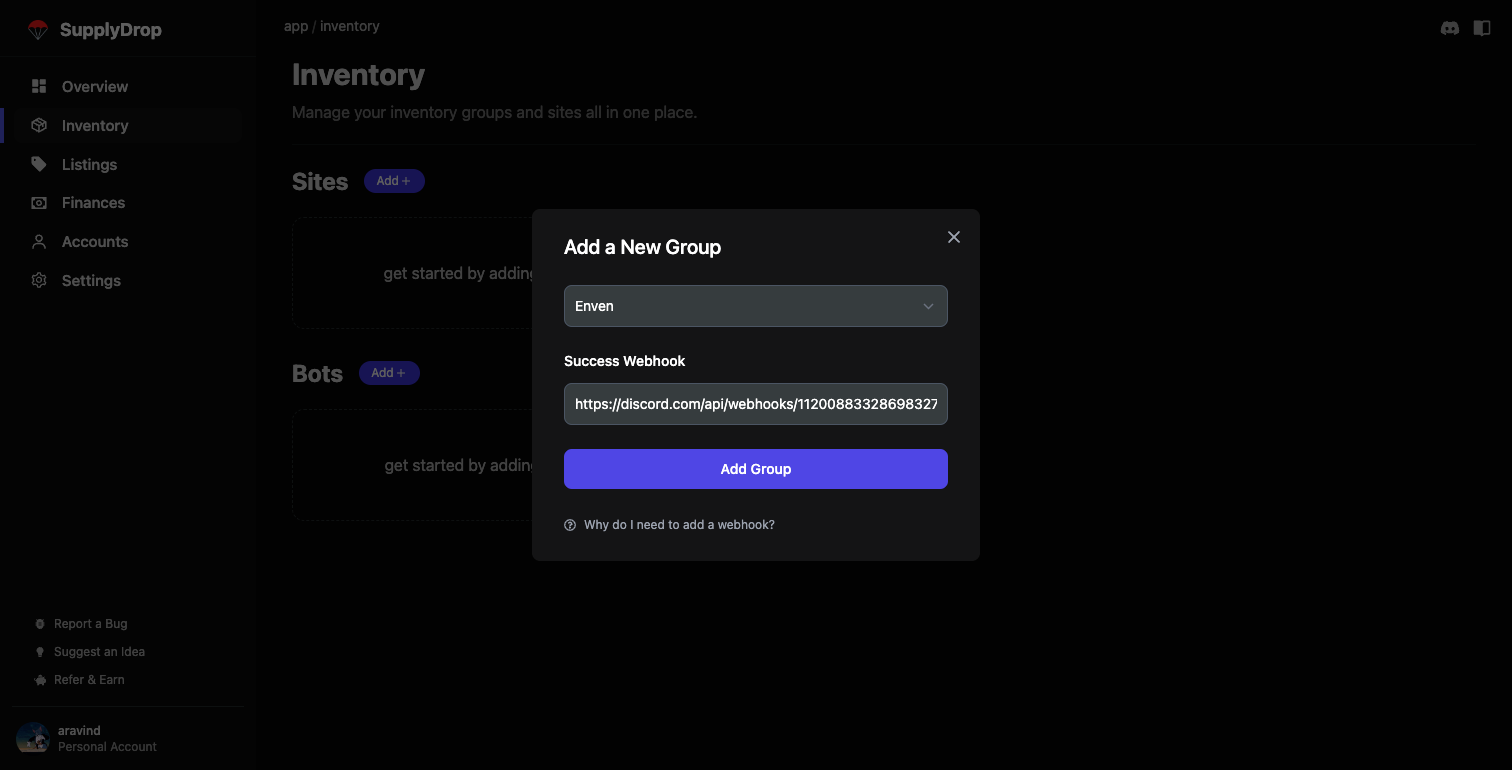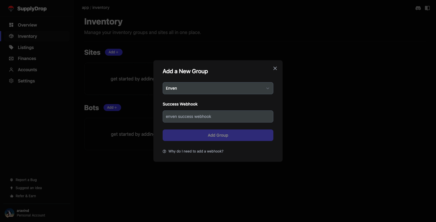 A bot group contains all items from a specific automation bot. Currently, SupplyDrop only supports select freebie bots. Skip this section if you do not have a freebie bot. To add a bot, click the “Add +” button under the bots section.